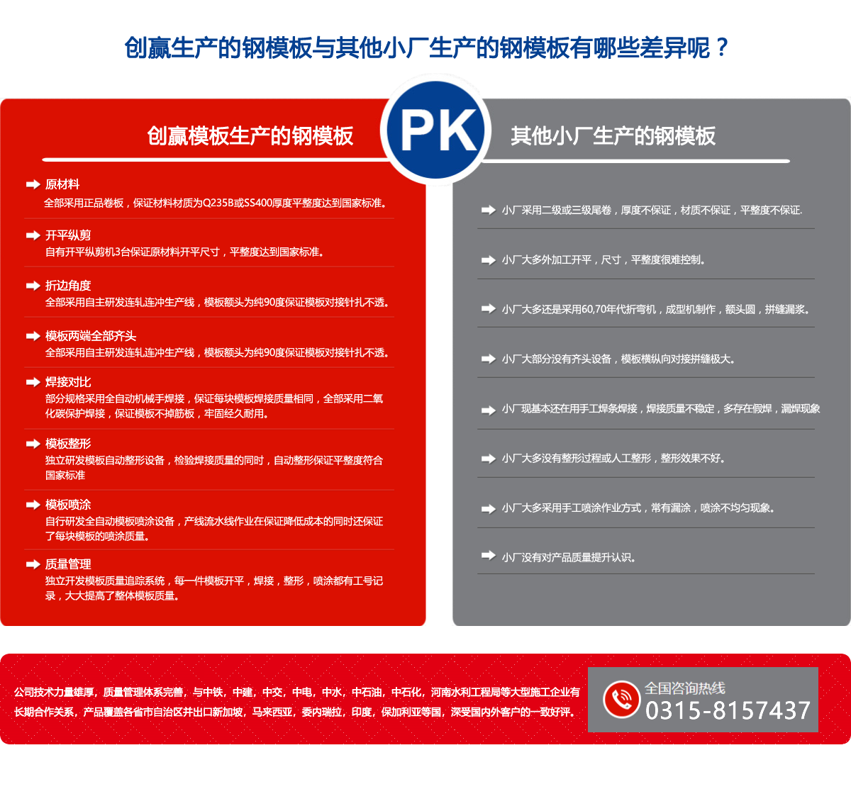 唐山創(chuàng)贏模板有限公司(原唐山豐南雙贏金屬結構廠)始建于一九九七年,是具規(guī)模實力的組合模板生產企業(yè),公司自行設計制造的十二條上卷,連軋,連沖,整形,機械人焊接,調直,噴漆,打包鋼模板生產,實現了自動化一條龍生產,品質優(yōu),效率高,規(guī)格型號為:寬度100-1200mm, 長度300-3000mm, 板厚1.8-4.0mm。 年產量可達200萬平方米,公司創(chuàng)新研制的輕型鋼框組合快拆鋼模板體系,是傳統組合小鋼模升級換代產品,可滿足房建,地下管廊,涵洞,公路,鐵路及各類施工企業(yè)的需要,輕型鋼框組合快拆鋼模板體系介紹及應用,已在2017年《施工技術》雜志及《模板腳手架行業(yè)協會》雜志發(fā)表,詳情請查閱公司網站。 公司生產的噴漆鋼跳板,鍍鋅鋼跳板,采用連軋一次沖孔,承載力大,孔距均勻,外形美觀,年產量可達50萬塊,公司獨創(chuàng)的C型鋼生產線,以其產量高,強度大,成本低,交活迅速,在同行業(yè)占有較大優(yōu)勢,可與C型鋼廠家及各類施工企業(yè)合作共贏.